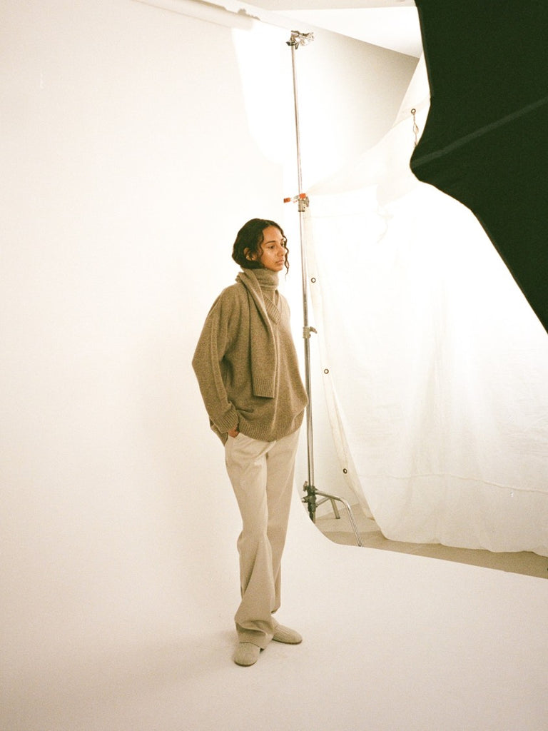 V-Neck Wool Sweater with Integrated Scarf Detail